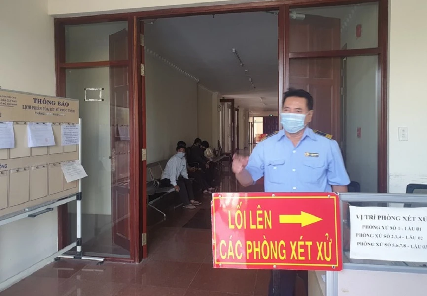 Bảo vệ tòa án nhắc nhở người dân mang khẩu trang khi đến cơ quan liên hệ công việc. Ảnh: HY