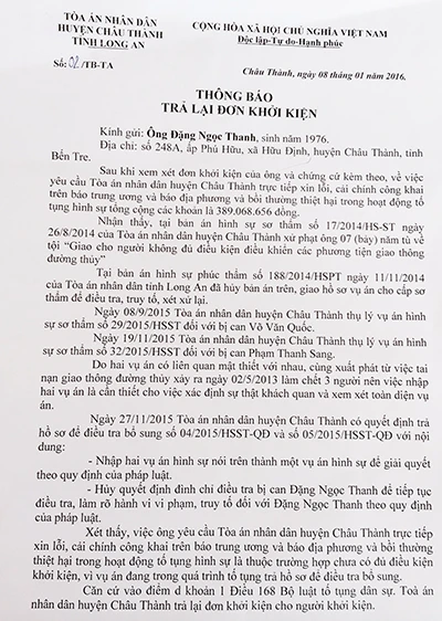 “Mặt khác, ngày 27-11-2015, TAND huyện Châu Thành có quyết định trả hồ sơ để điều tra bổ sung với nội dung: Nhập hai vụ án hình sự nói trên thành một vụ án hình sự để giải quyết theo quy định của pháp luật; hủy quyết định đình chỉ điều tra bị can Đặng Ngọc Thanh để tiếp tục điều tra, làm rõ hành vi vi phạm, truy tố đối với Đặng Ngọc Thanh. Vì thế việc yêu cầu TAND huyện Châu Thành trực tiếp xin lỗi, cải chính công khai trên báo trung ương và báo địa phương và bồi thường thiệt hại trong hoạt động tố tụng hình sự là thuộc trường hợp chưa có đủ điều kiện khởi kiện vì vụ án đang trong quá trình tố tụng trả hồ sơ để điều tra bổ sung” - thông báo của tòa Châu Thành nêu rõ.