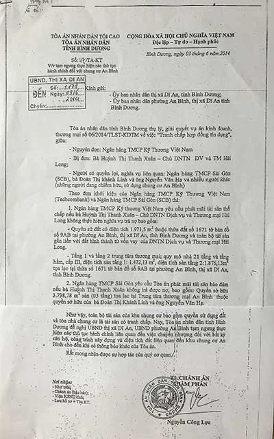 Ngày 3-6-2014, thẩm phán thụ lý thừa lệnh chánh án TAND tỉnh ký Văn bản số 117/TA-KT không có tiêu đề, không có căn cứ vào điều luật nào gửi UBND phường An Bình và thị xã Dĩ An. Nội dung là tạm ngưng thực hiện các thủ tục hành chính liên quan đến việc chuyển nhượng đối với toàn bộ chung cư An Bình trong đó có phần trung tâm thương mại.