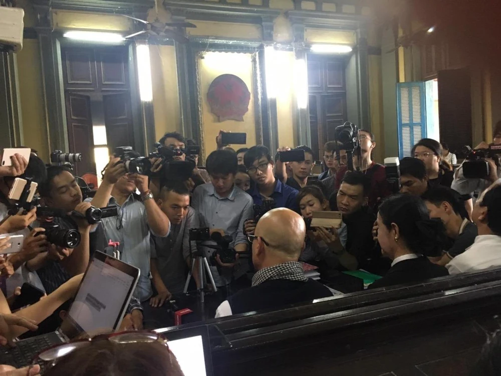 Ông Vũ giữa rừng vây báo chí trước khi tòa tuyên án. Ảnh: PL