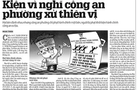 Ngày 12-8-2013, Công an phường An Phú ra quyết định xử phạt hành chính anh K. vì hành vi trực tiếp xâm phạm sức khỏe người khác có tổ chức, mức phạt là 2 triệu đồng. Không chấp nhận, anh K. đã làm đơn kiện công an phường ra tòa. Xử sơ thẩm, TAND quận 2 đã bác đơn kiện. Anh K. làm đơn kháng cáo.