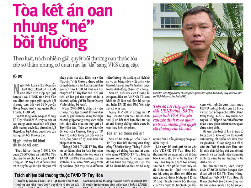 Ngược lại, trong thông báo trả lại đơn yêu cầu bồi thường oan cho bà Ngọc Anh, VKSND TP Tuy Hòa lại khẳng định: “Căn cứ điểm b khoản 1 Điều 36 Luật Trách nhiệm bồi thường thì trách nhiệm bồi thường đối với bà Nguyễn Hồng Ngọc Anh thuộc TAND TP Tuy Hòa”.
