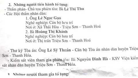 Theo tố cáo, kiểm sát viên Nguyễn Đình Hà (VKS huyện Triệu Sơn), Chánh án TAND huyện Triệu Sơn Lê Ngọc Hiệp, Thẩm phán Lê Thị Thu, thư ký tòa án Lê Sỹ Thuần là những người trực tiếp tiến hành tố tụng đã đe dọa và làm tiền bị cáo.