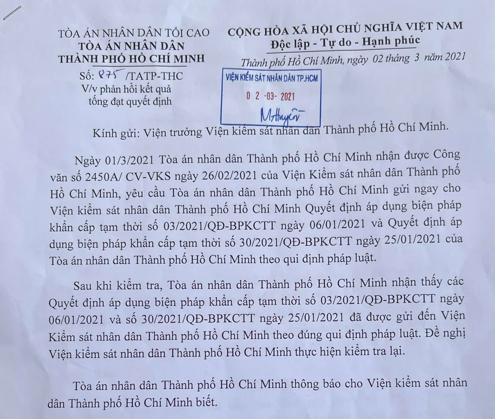 Văn bản TAND TP.HCM vừa gửi đi ngày 2-3