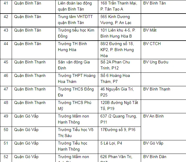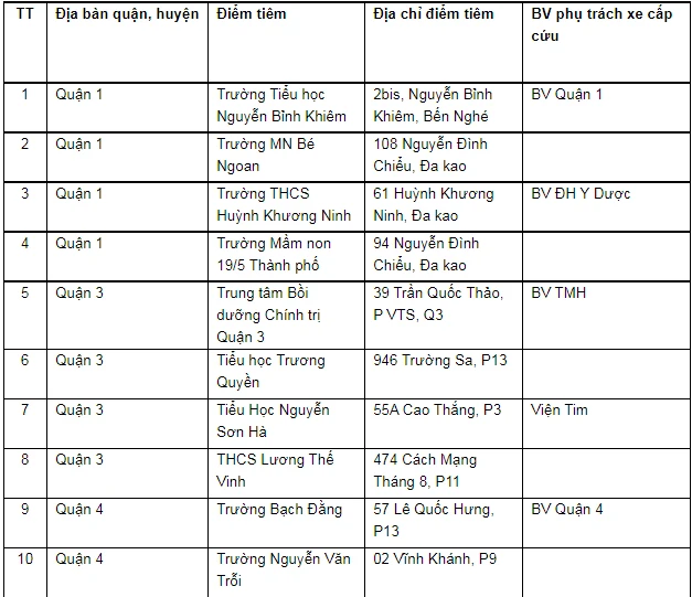 Sở Y tế TP.HCM phân công, bố trí lực lượng tại 96 điểm tiêm cộng đồng. Khi có sự cố, lực lượng tại chỗ xử trí ban đầu thuộc đội tiêm chủng sẽ báo động đỏ xe cấp cứu tại các BV được phân công và chuyển bệnh an toàn (nếu có chỉ định).