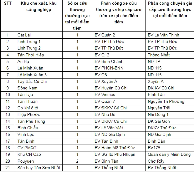 Ngoài Trung tâm Cấp cứu 115 TP.HCM, toàn bộ bệnh viện (BV) trên địa bàn TP.HCM tổ chức các kíp cấp cứu cùng phương tiện, xe cứu thương phụ trách các điểm tiêm tại cộng đồng.