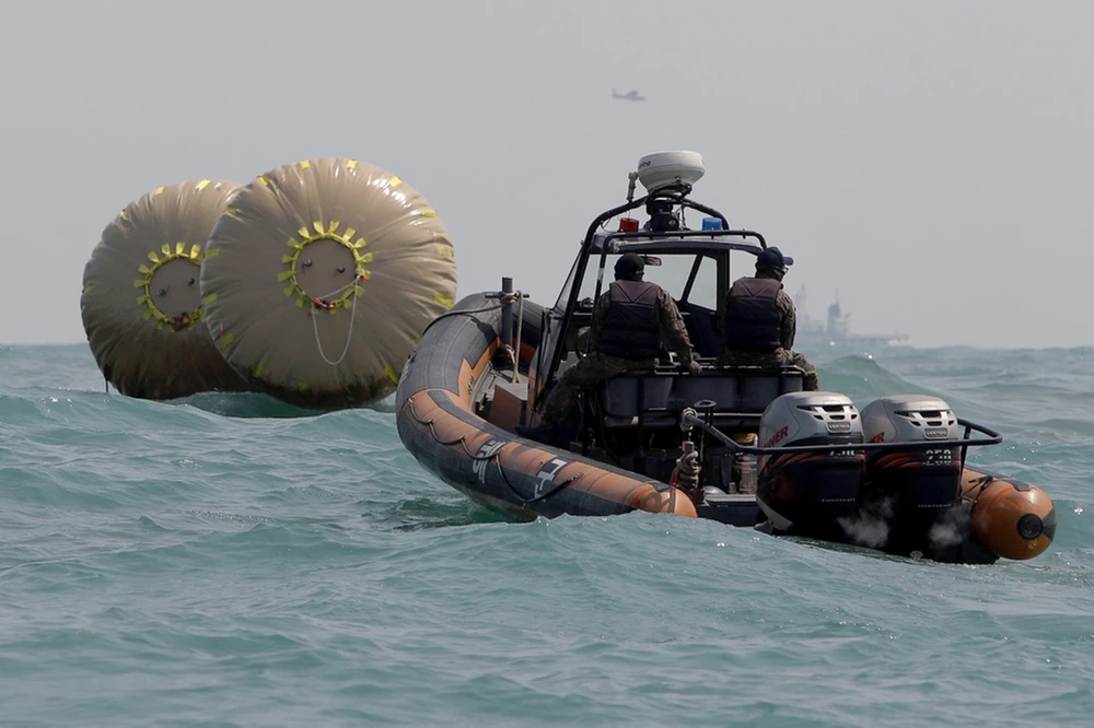 Phà Sewol đã hoàn toàn chìm xuống nước, vị trí phà chìm được đánh dấu bằng phao lớn để thuận tiện cho việc tìm kiếm. Ảnh: Mirror