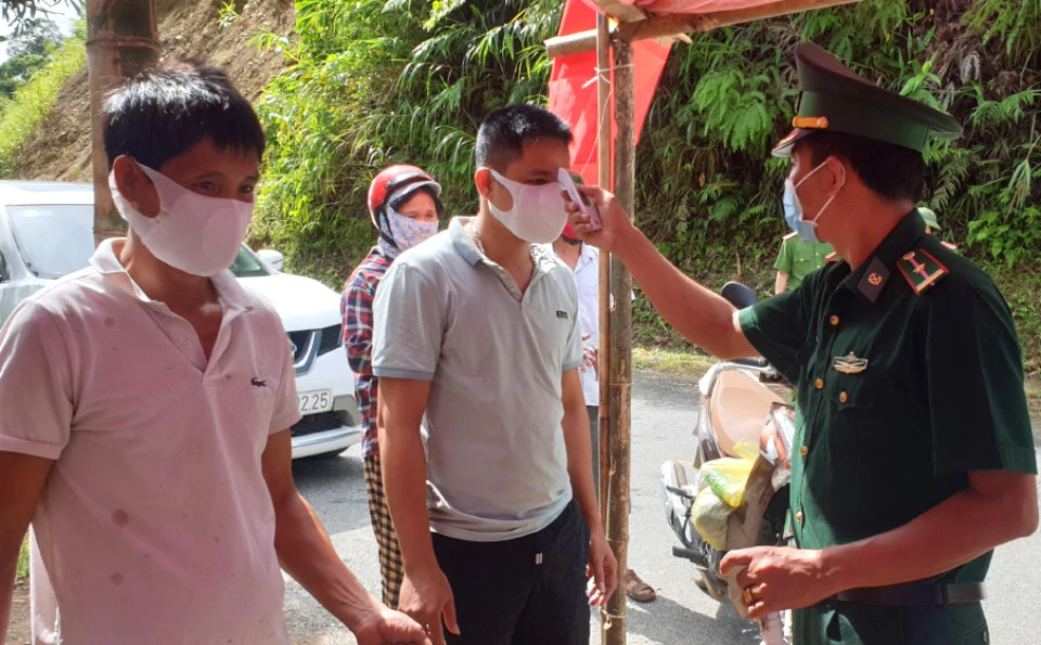 Các chiến sĩ biên phòng ở huyện vùng cao biên giới Mường Lát thực hiện đo thân nhiệt và kiểm soát chặt chẽ đường biên nhằm ngăn chặn người nước ngoài nhập cảnh trái phép vào Thanh Hóa. Ảnh: ĐẶNG TRUNG