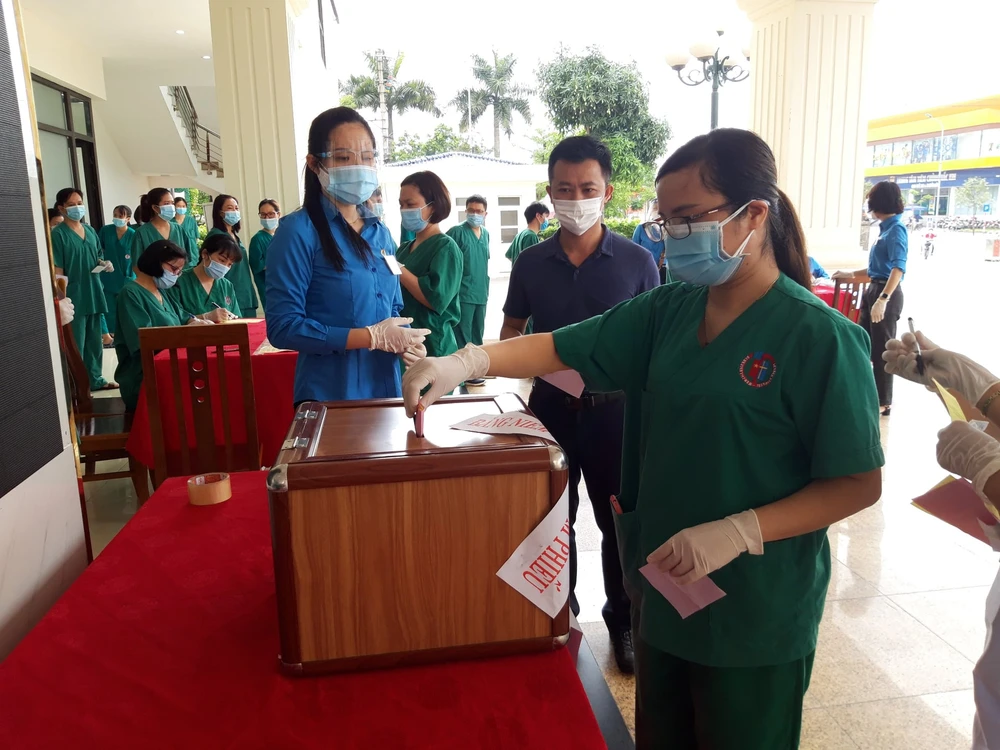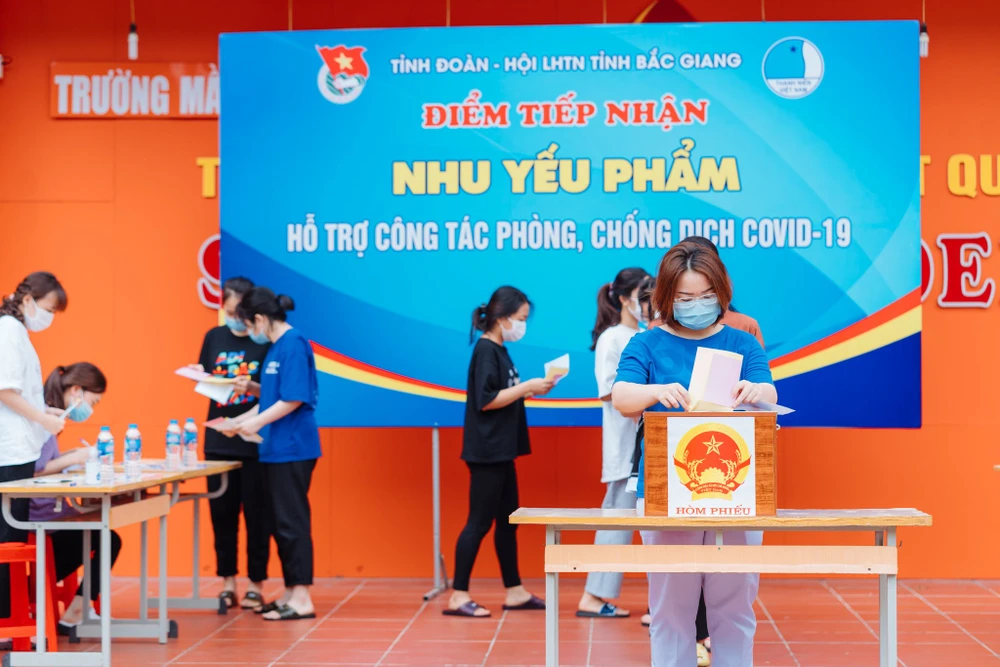 Đoàn sinh viên Đại học Kỹ thuật Y tế Hải Dương, hiện đang có mặt tại Bắc Giang làm tình nguyện, thực hiện bầu cử.