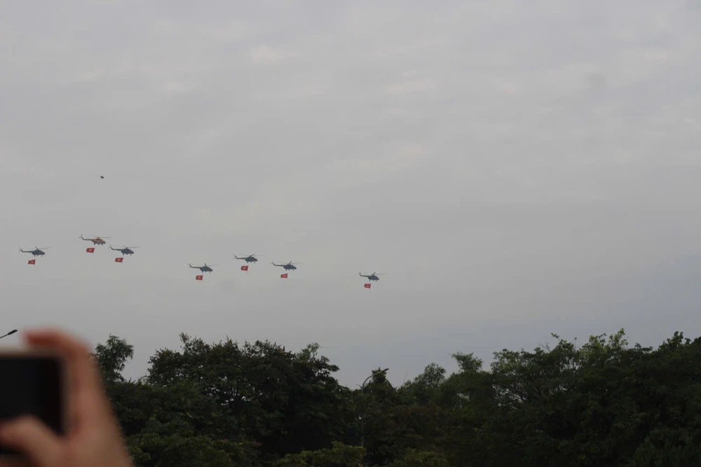 Dẫn đầu là biên đội trực thăng Mi-171, Mi-17, Mi-8, mang cờ Đảng, cờ Tổ quốc tung bay trên Quảng trường Ba Đình lịch sử.