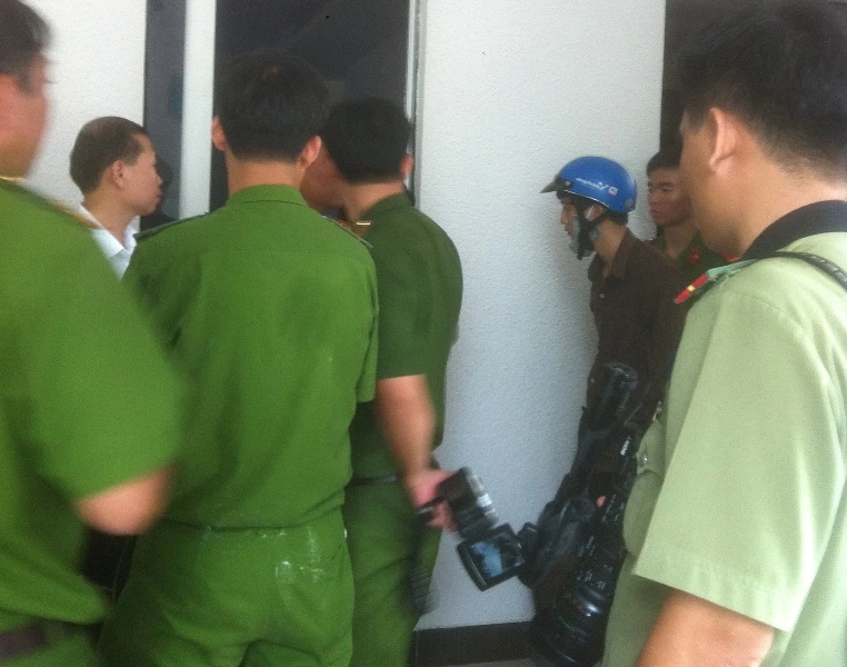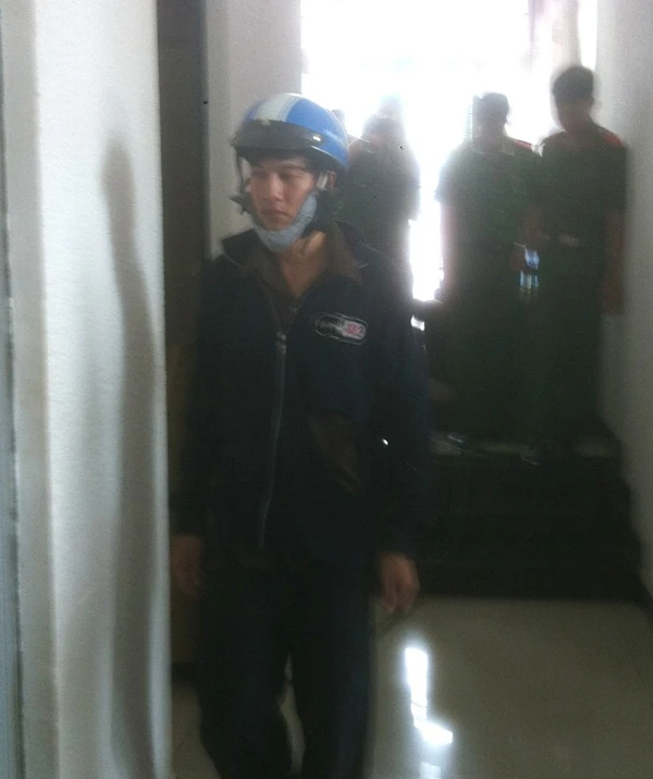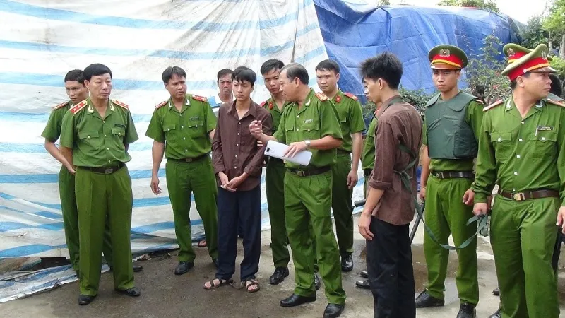 Hai bị can Nguyễn Hải Dương và Vũ Văn Tiến được đưa tới để thực nghiệm hiện trường.