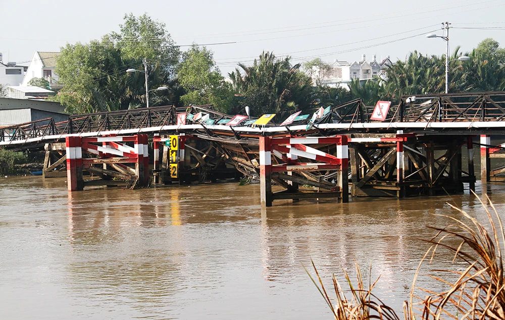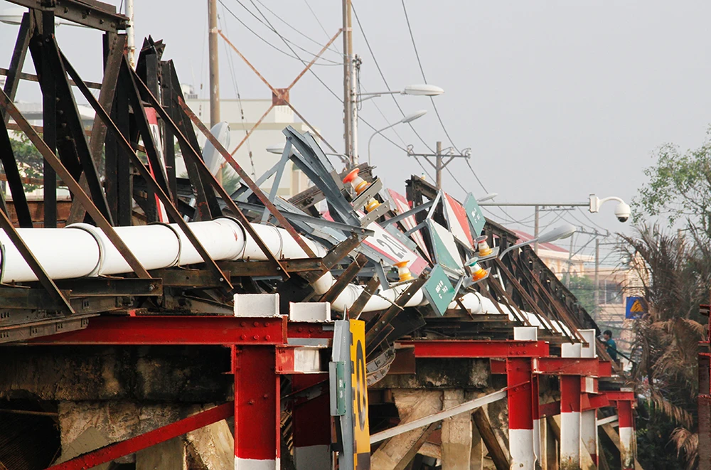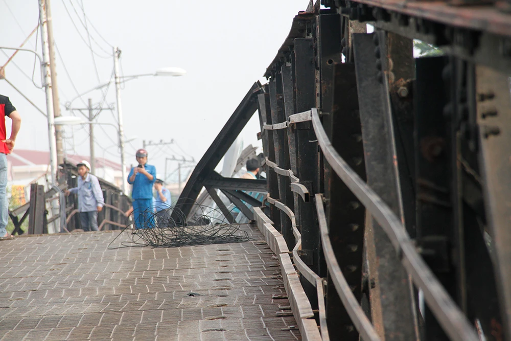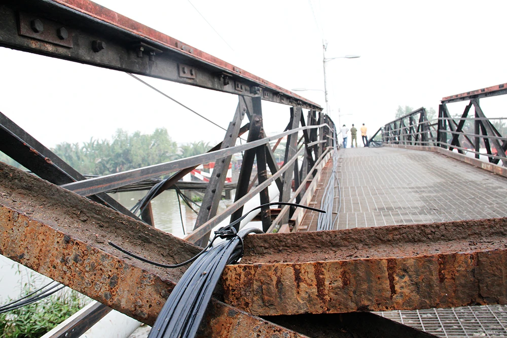 Theo quan sát, một nhịp cầu bị nghiêng oặt xuống sông Long Kiển, nhiều kết cấu thép bị vặn xoắn, đứt gãy nghiêm trọng.