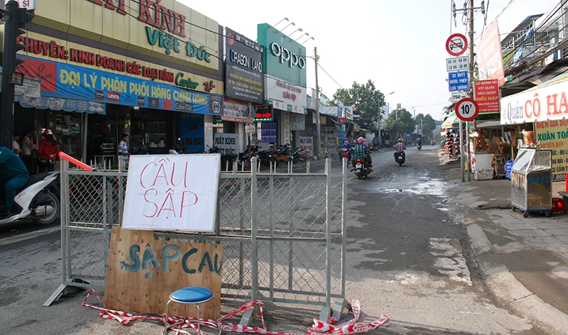 Ở hai đầu cầu trên đường Lê Văn Lương, lực lượng chức năng dựng biển cảnh báo để tổ chức lại giao thông. Các phương tiện muốn đi qua phải chọn lộ trình khác qua đường Nguyễn Bình hoặc đường Đào Sư Tích.