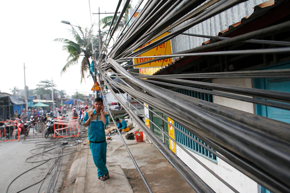 Do xe tải kéo đứt hư hỏng đường dây cáp viễn thông và điện nên các nhân viên điện lực, viễn thông tiến hành khắc phục lại sự cố.