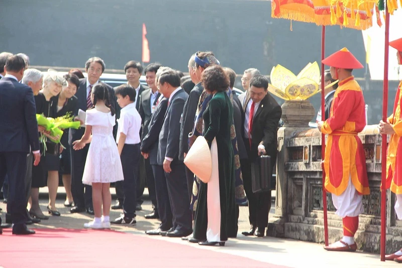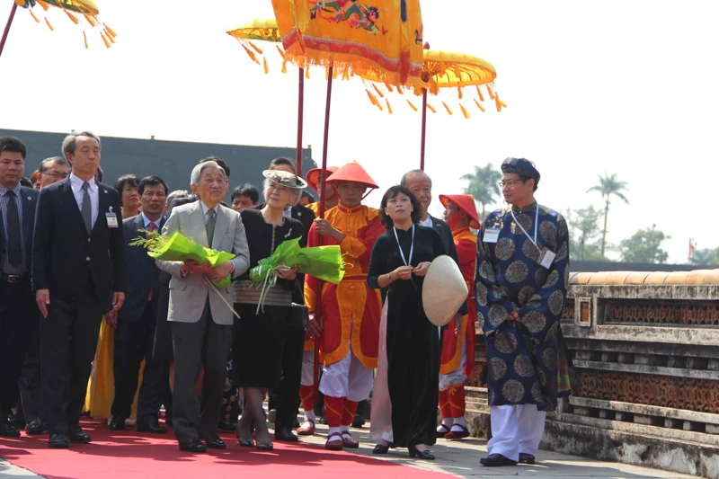 Đón Nhật hoàng tại Đại nội Huế có ông Nguyễn Ngọc Thiện - Bộ trưởng Bộ VHTTDL cùng ông Lê Trường Lưu - Bí thư Tỉnh ủy, ông Nguyễn Văn Cao - Chủ tịch UBND tỉnh Thừa Thiên - Huế, ông Phan Thanh Hải - Giám đốc Trung tâm Bảo tồn Di tích Cố đô Huế .