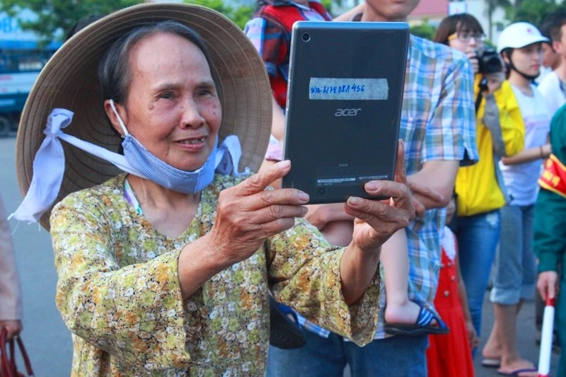 Một khán giả ghi lại hình ảnh của những đoàn nghệ thuật đường phố.