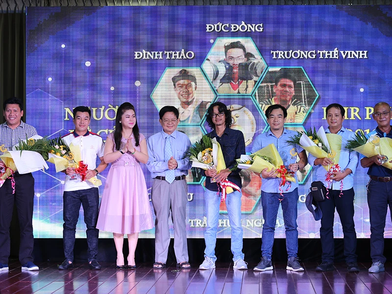 Doanh nhân Diệp Thảo và Phó Tổng biên tập báo Pháp Luật TP.HCM Hoàng Chương (thứ ba và tư từ trái sang) tặng kỷ niệm chương cho các thành viên giới thiệu năm đề cử và Vinh danh Fair Play.