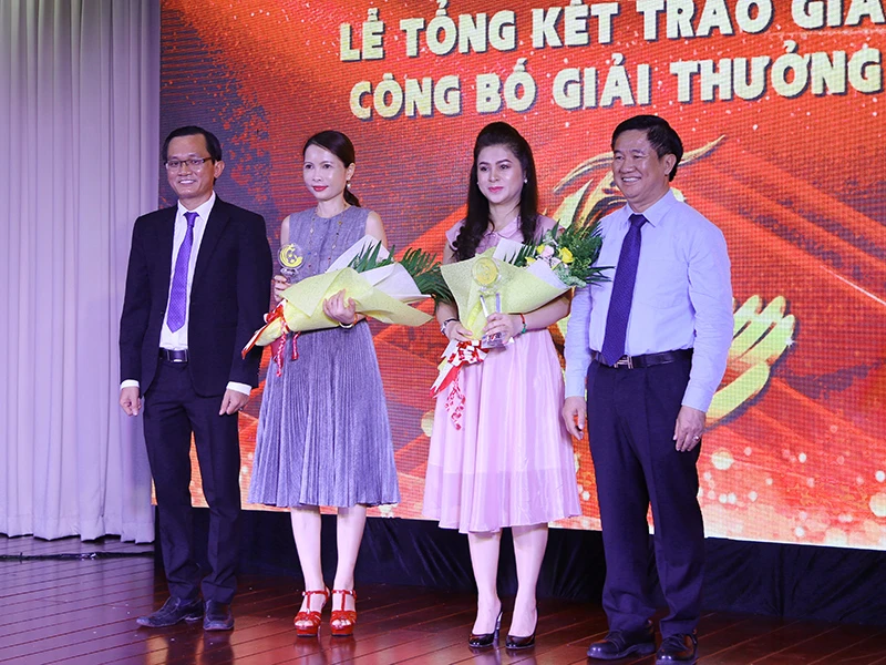 Phó Tổng biên tập báo Pháp Luật TP.HCM Cát Thị Kim Xuân tặng kỷ niệm chương và tri ân những nhà tài trợ đồng hành cùng giải 2019.