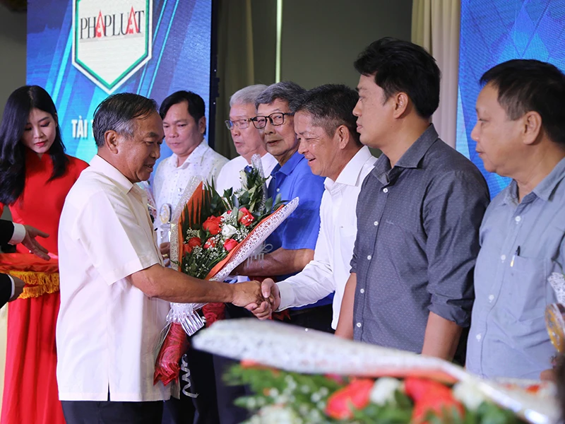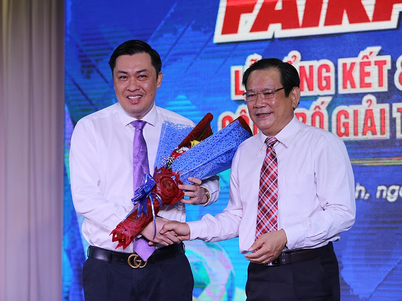 Tổng biên tập báo Pháp Luật TP.HCM Mai Ngọc Phước tặng hoa cho đại diện của LĐBĐ Việt Nam - Phó Chủ tịch VFF Cao Văn Chóng.
