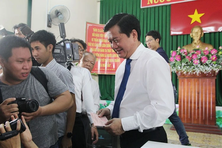 6 giờ 30 phút, Bí thư Thành ủy Đinh La Thăng có mặt tại điểm bỏ phiếu và vui vẻ trao đổi với bà con cử tri.
