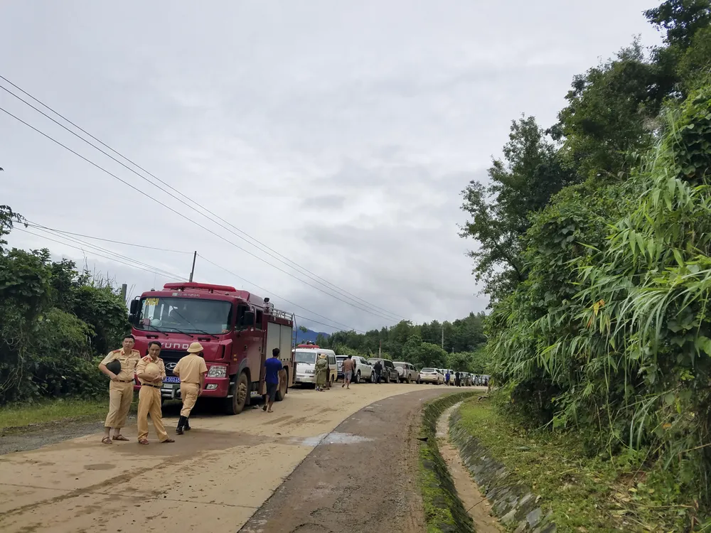 Phía bên ngoài, nơi đặt sở chỉ huy cách khu vực Đoàn 337 khoảng 3km, hiện tại tuyến đường vào Đoàn kinh tế - Bộ Quốc phòng 337 vẫn chưa được lưu thông. Lực lượng chức năng chốt chặn khuyến cáo người dân không được qua lại khu vực nguy hiểm. Ảnh: NGUYỄN DO