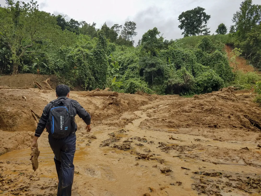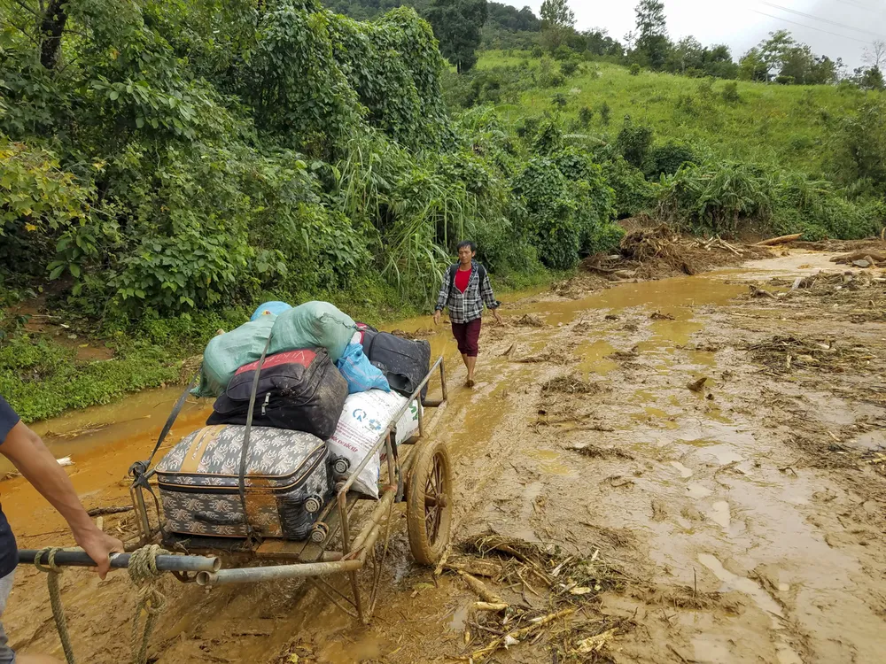 Từ trạm chỉ huy phải đi đường bộ khoảng 3km đường bộ, nhiều bùn lầy, cùng với với những ngon núi đã nhão vì nhiều ngày mưa có thể sạt lở bất cứ lúc nào. Ảnh: NGUYỄN DO