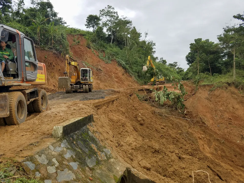 Xe cơ giới được đưa vào để khôi phục lại tuyến đường, sớm được thông tuyến, đưa phương tiện vào khu sạt sở để tham gia việc chở các chiến sĩ tử vong ra bên ngoài. Ảnh: NGUYỄN DO