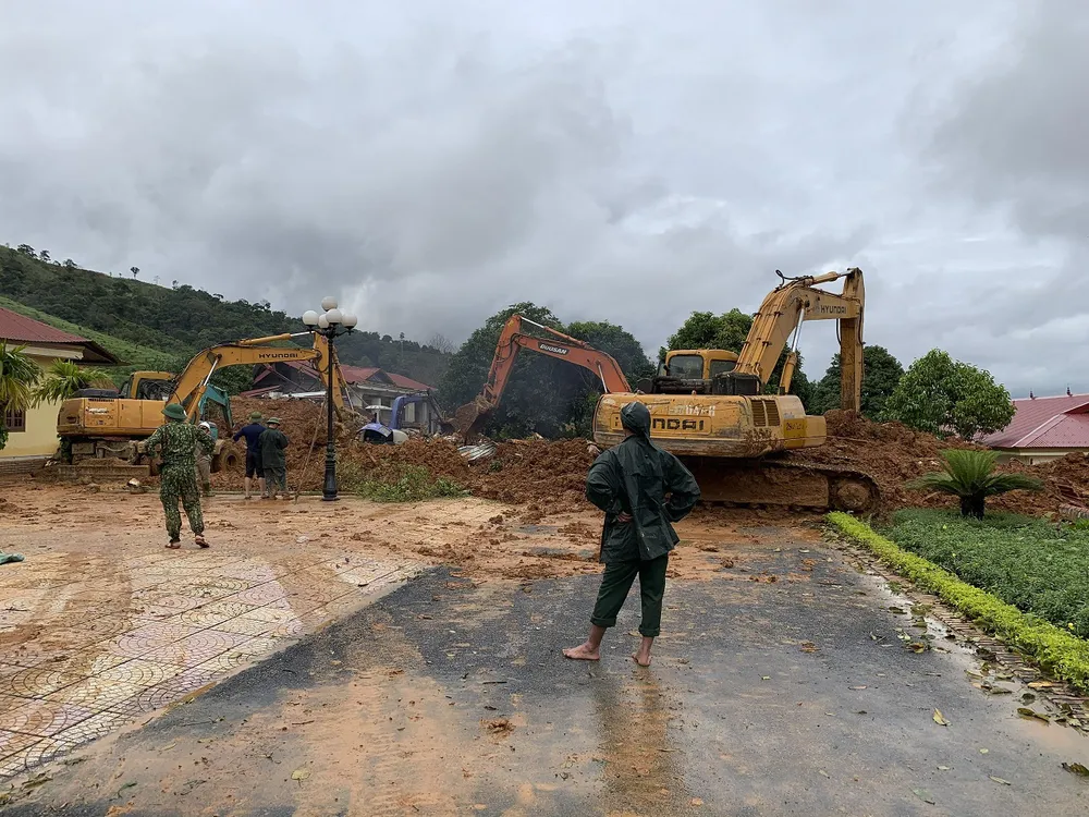 8 xe múc của các công ty, nhà máy ở bên trong khu vực bị chia cắt được tăng cường đến hiện trường để tham gia cứu hộ vì phương tiện bên ngoài chưa vào được bên trong. Đến thời điểm này, lực lượng chức năng đã tìm thấy 15/22 chiến sĩ, cuộc tìm kiếm vẫn đang được khẩn trương tiến hành. Ảnh: NGUYỄN DO
