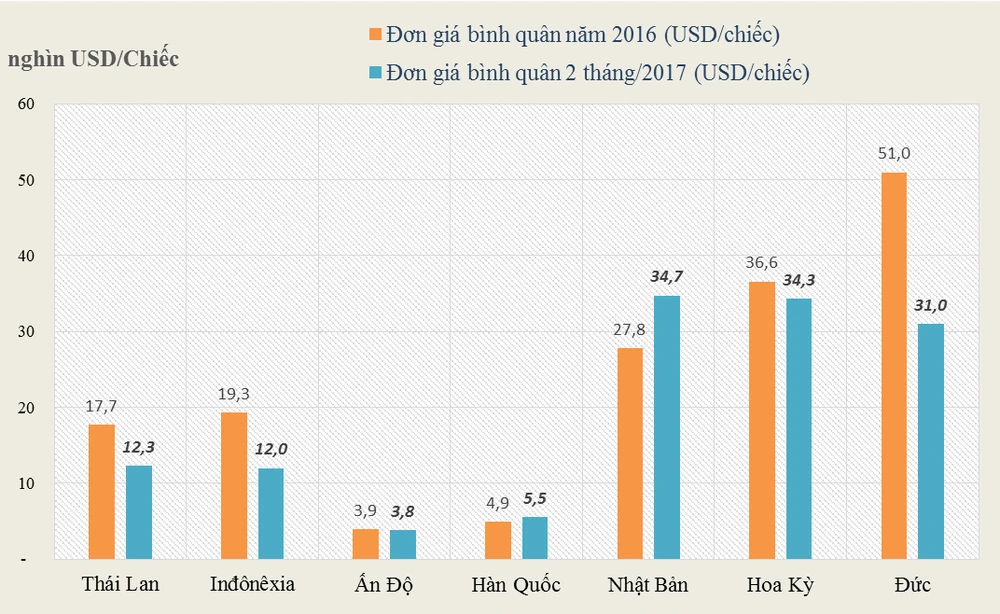 Đơn giá bình quân đạt 4.964 USD/chiếc, tăng nhẹ so với với đơn giá 4.764 USD/chiếc của hai tháng năm 2016.
