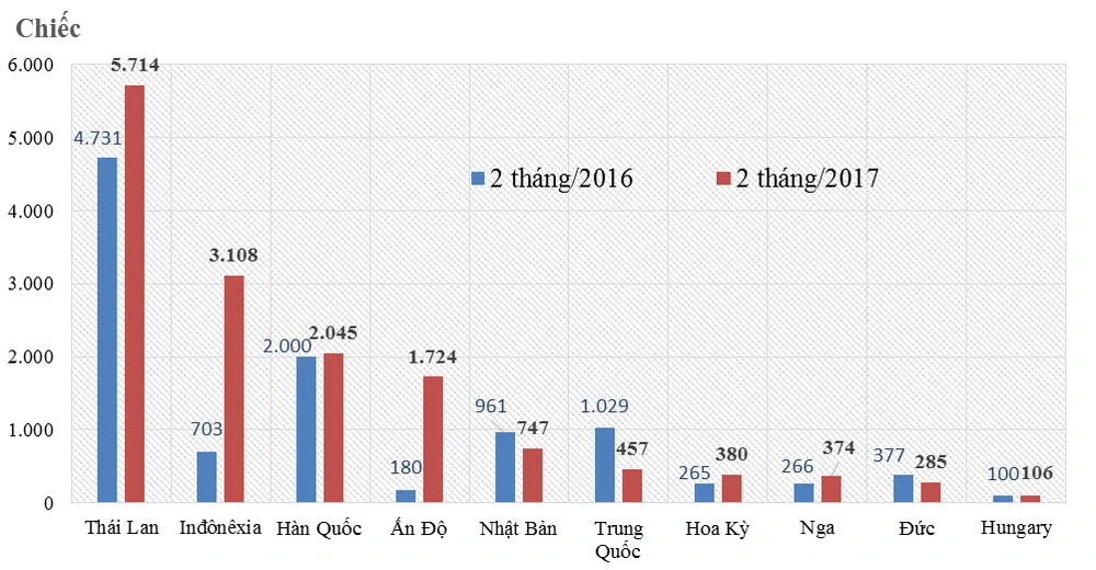 Trong đó, hai thị trường trong ASEAN xuất khẩu ô tô nguyên chiếc sang Việt Nam là Thái Lan và Indonesia. Ô tô nguyên chiếc các loại xuất khẩu từ Thái Lan hai tháng đầu năm 2017 đạt 5.714 chiếc, trị giá 110 triệu USD, tăng 20,8% về lượng và tăng 37,6% về trị giá so với cùng kỳ năm 2016.
