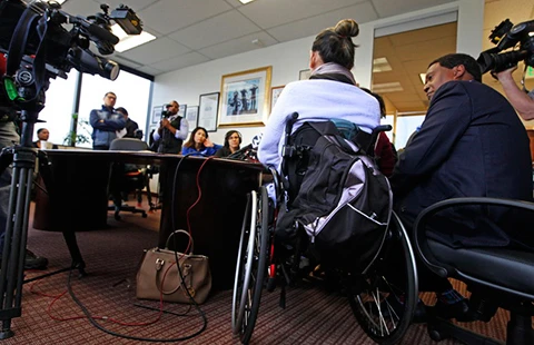 Hung Lam (không muốn lộ diện mặt), tại văn phòng luật sư John L. Burris, trả lời báo chí sau phán quyết San Jose bồi thường cho ông 11,3 triệu USD. Ảnh: MERCURY NEWS
