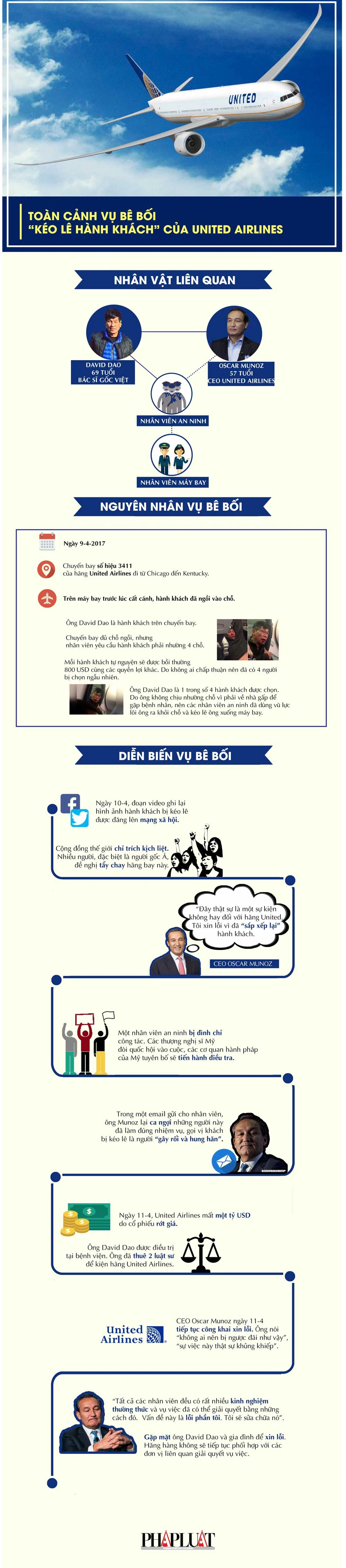 (PLO)- Ngày 9-4, ông David Dao bị các nhân viên an ninh dùng vũ lực lôi ra khỏi ghế và kéo lê trên sàn máy bay chuyến 3411 của hãng United Airlines vì từ chối nhường chỗ sau khi hãng này cần cho bốn nhân viên bay gấp dù chuyến bay đã đầy khách.