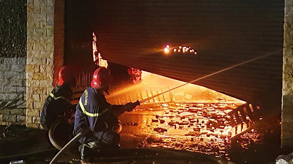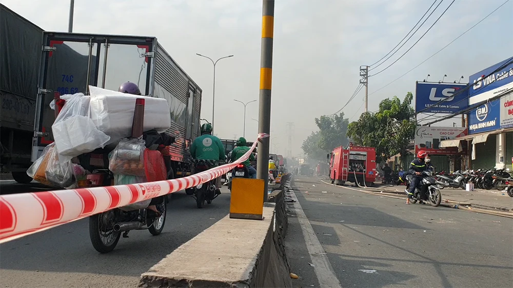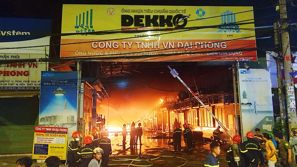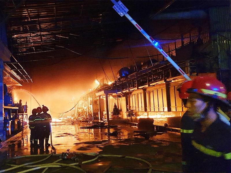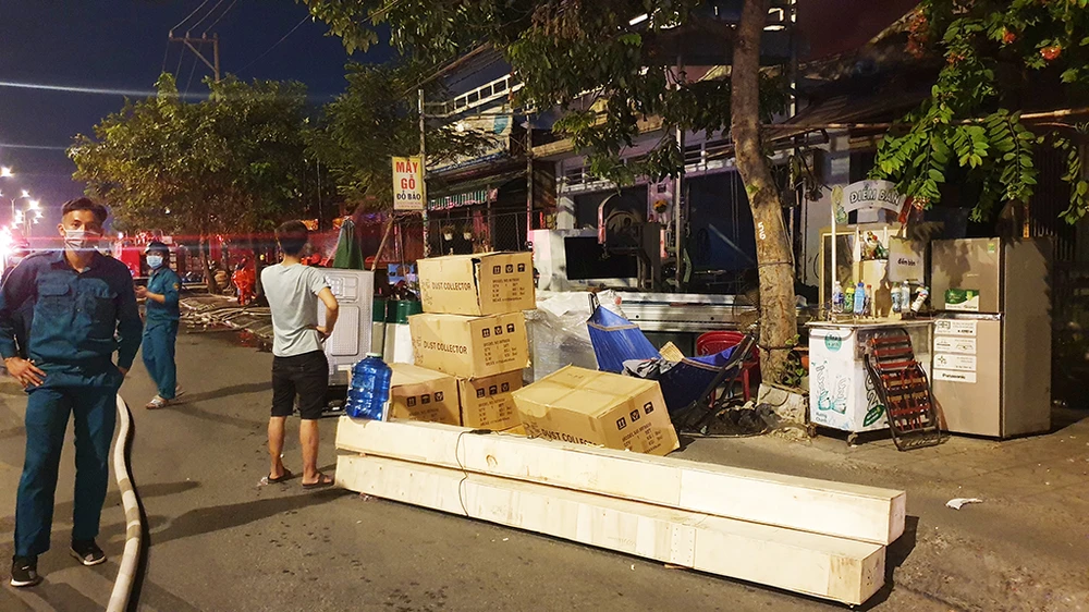 Đám cháy sau đó lan sang công ty nhựa kế bên và uy hiếp các ki-ốt, nhà dân gần đó.
