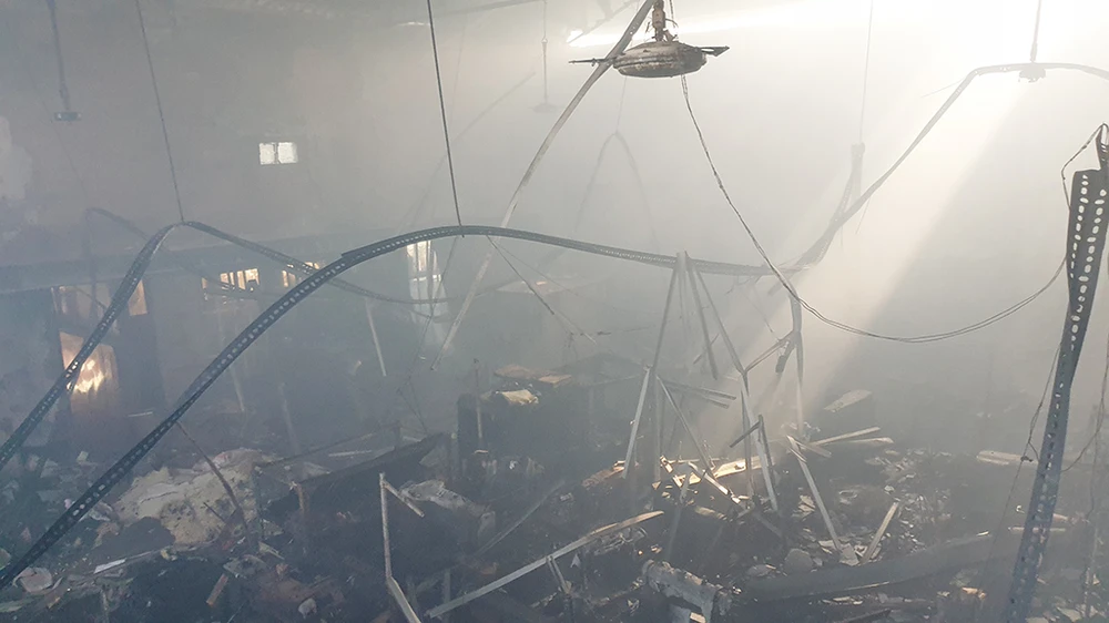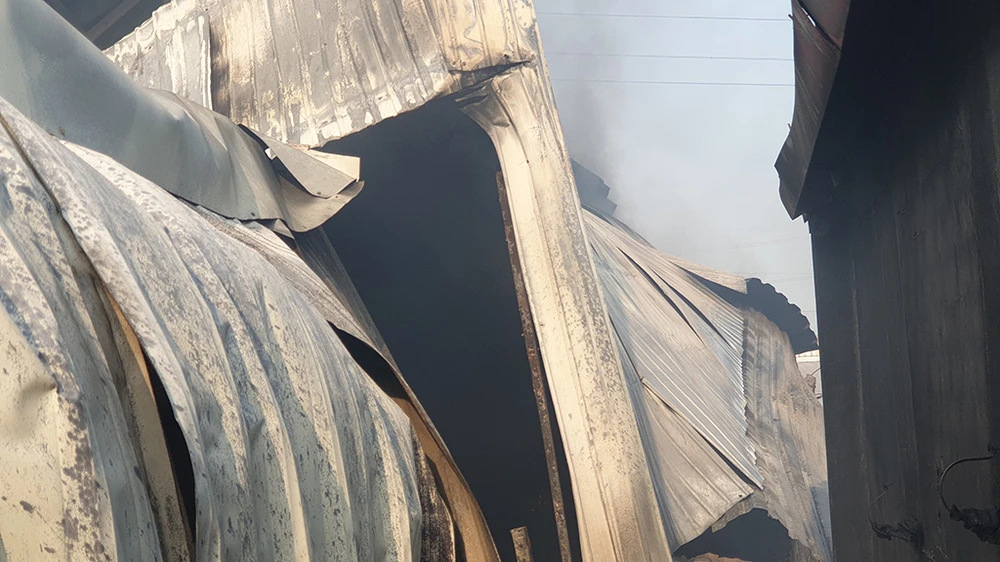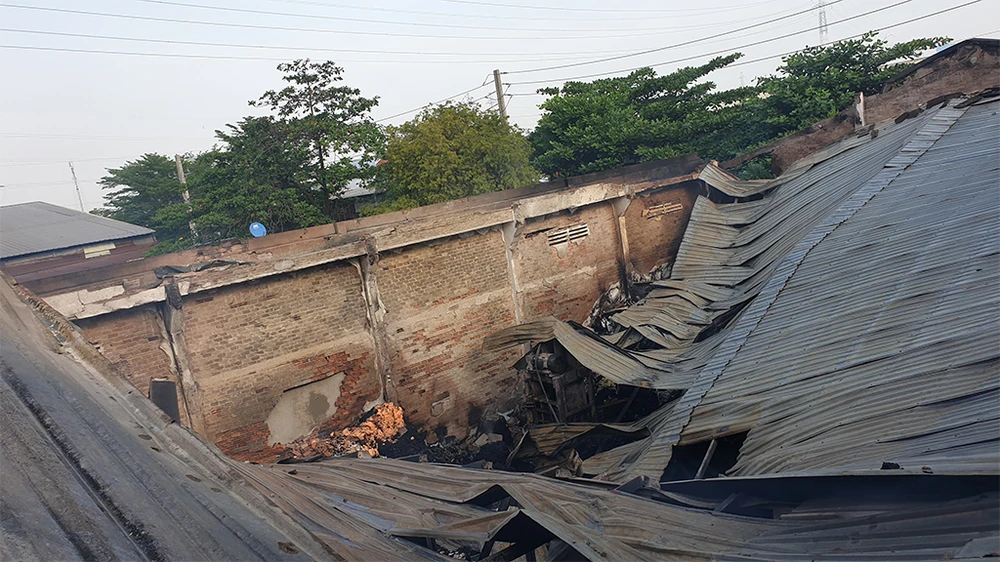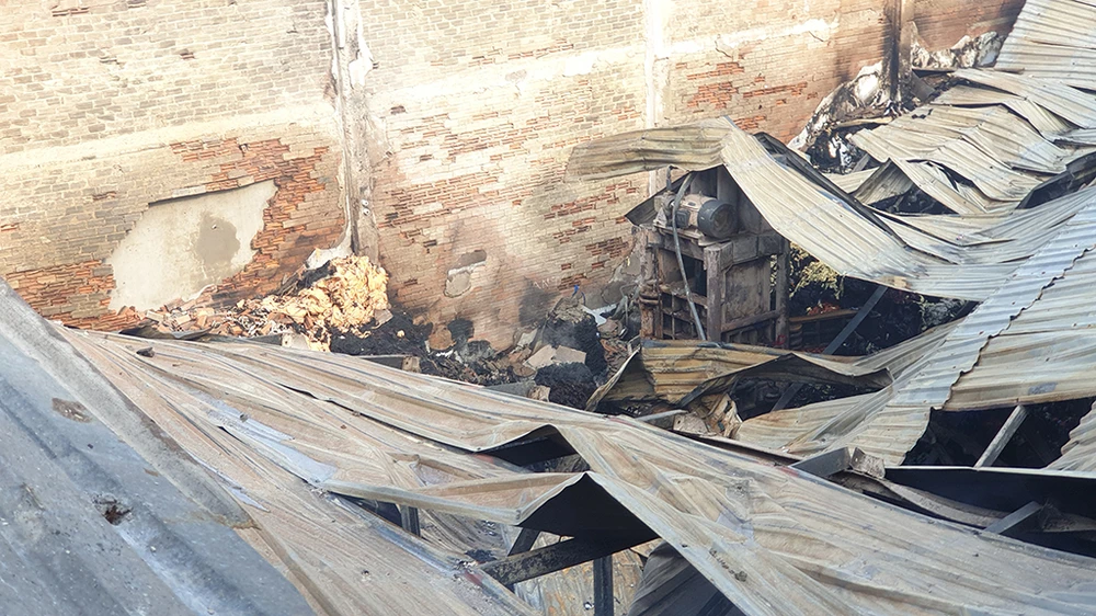 Dưới sức nóng khủng khiếp mái tôn nhà xưởng bị đổ sập, biến dạng nghiêm trọng.