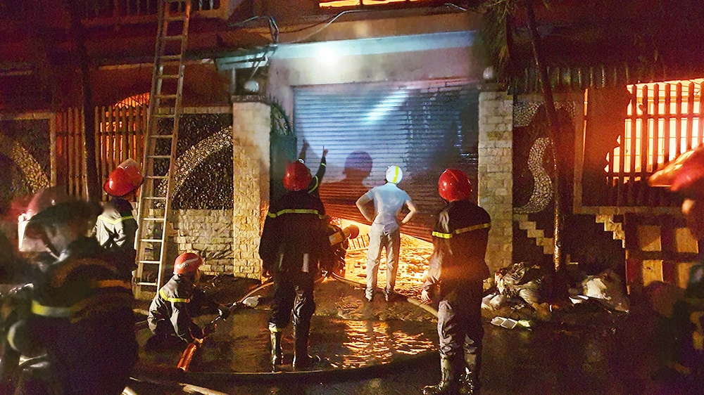 Do cửa bị khóa, cảnh sát phải huy động máy cắt để mở cửa, vào bên trong dập lửa.