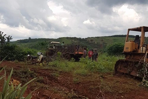 Sáng 23-10, Công ty TNHH Long Sơn đã cho một nhóm đông công nhân đưa máy móc, thiết bị vào san ủi vườn điều của ông Hoàng Văn Thắng tại tiểu khu 1536 (Quảng Trực, Tuy Đức) thuộc lâm phần do công ty quản lý.
