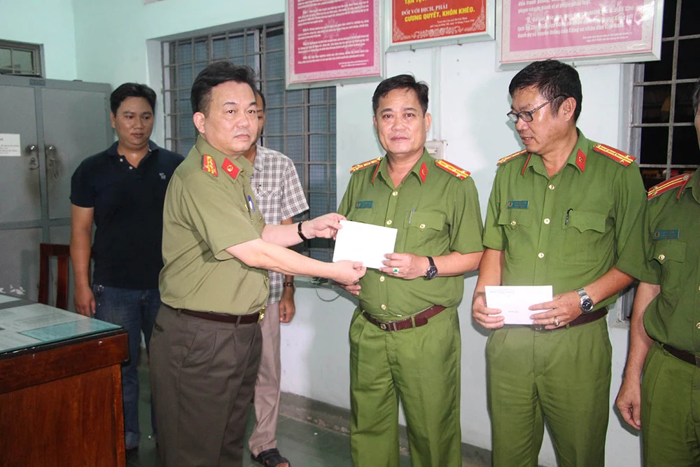 Đại tá Nguyễn Khắc Cường, Giám đốc Công an tỉnh Khánh Hòa thưởng nóng các đơn vị trực tiếp phá án. Ảnh do Công an Khánh Hòa cung cấp