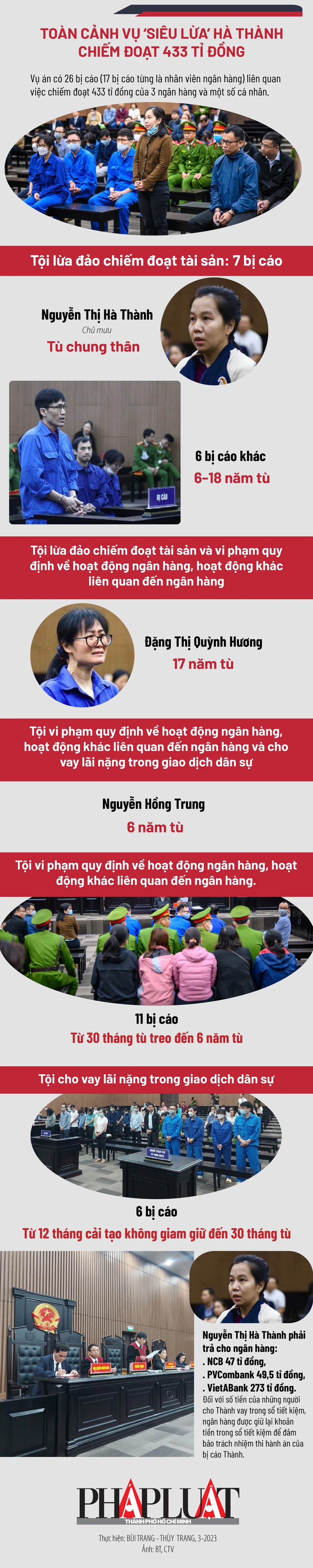 (PLO)- Vụ án có 26 bị cáo liên quan việc chiếm đoạt 433 tỉ đồng của ba ngân hàng và một số cá nhân. Nguyễn Thị Hà Thành phải trả cho ngân hàng NCB 47 tỉ đồng, PVCombank 49,5 tỉ đồng, VietABank 273 tỉ đồng.