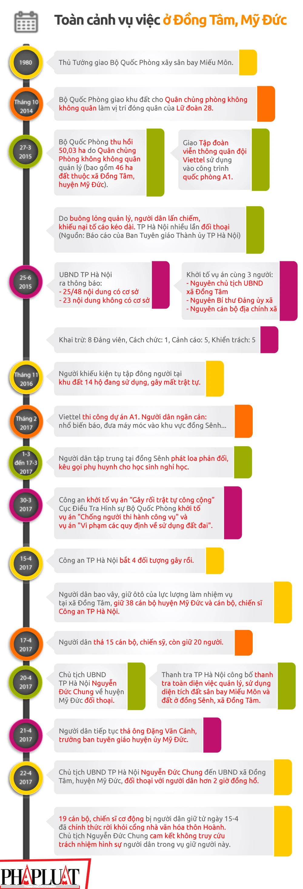 (PLO)- Chiều 22-4, 19 cán bộ, chiến sĩ bị người dân Đồng Tâm giữ đã rời khỏi nhà văn hóa thôn Hoành. Chủ tịch Hà Nội Nguyễn Đức Chung cam kết không truy cứu trách nhiệm hình sự người dân. Cùng báo Pháp Luật TP.HCM nhìn lại toàn bộ sự việc này từ năm 1980 đến tháng 4-2017.