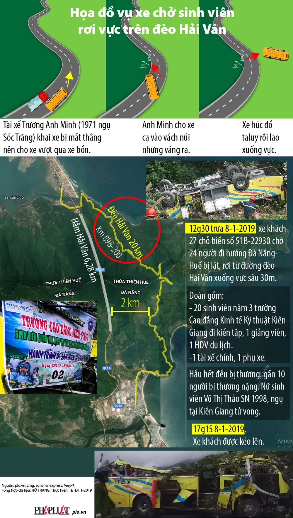 (PLO)- Trưa 8-1-2019, xe khách chở đoàn sinh viên năm 3 khoa quản trị du lịch trường Cao đẳng Kiên Giang đang qua khúc cua trên đèo Hải Vân đoạn cách chân đèo về phía Phú Lộc (Huế) khoảng 2 km thì bất ngờ lật nhào xuống đèo.