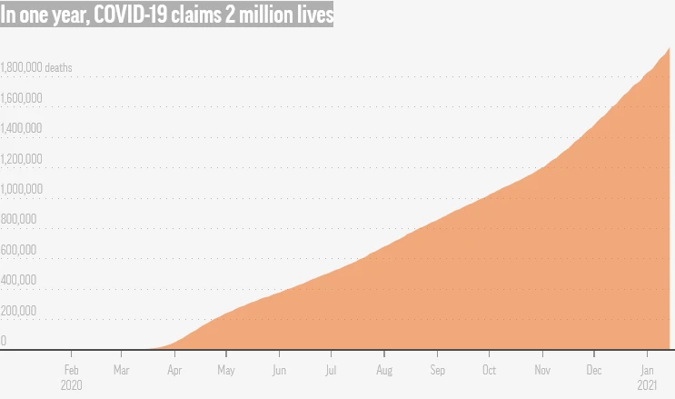 Vậy là chỉ sau hơn một năm, khi lần đầu tiên virus SARS-CoV-2 được phát hiện ở TP Vũ Hán, Trung Quốc thì trận đại dịch đã cướp đi mạng sống của hơn hai triệu người. Theo thống kê của Đại học Johns Hopkins, số người chết vì đại dịch hiện nay tương đương với dân số của Brussels, Mecca, Minsk hoặc Vienna. Nó gần tương đương với vùng đô thị Cleveland hoặc toàn bộ bang Nebraska, Mỹ.