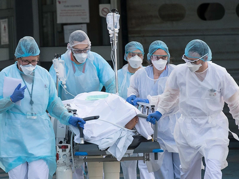 Nhân viên y tế di chuyển một bệnh nhân nhiễm COVID-19 tại TP Mulhouse, tỉnh Haut-Rhin (Pháp) hồi tháng 3-2020. Ảnh: AFP