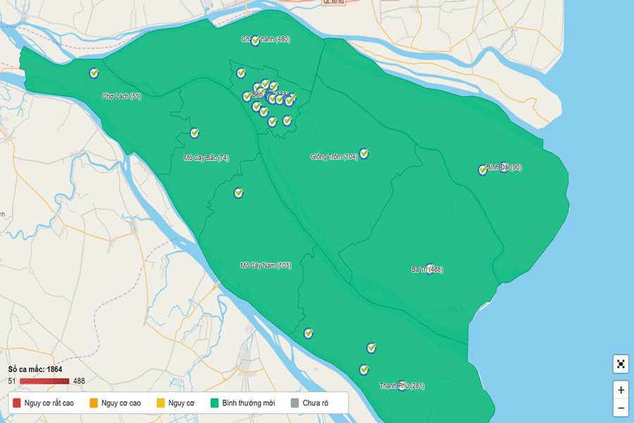 Bản đồ COVID-19 tỉnh Bến Tre đã chuyển sang trạng thái "vùng xanh" hoàn toàn.