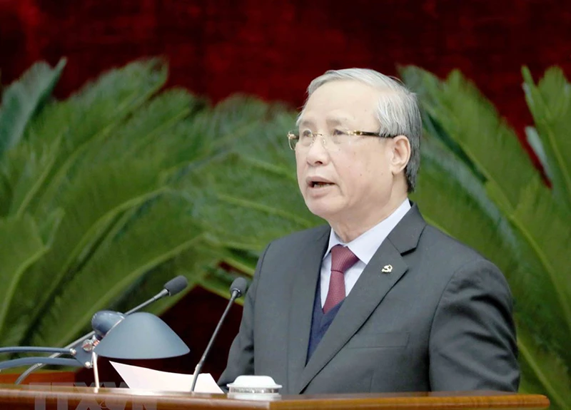 Ông Trần Quốc Vượng, Ủy viên Bộ Chính trị, Thường trực Ban bí thư, trình bày dự thảo Nghị quyết Hội nghị Trung ương lần thứ 14. Ảnh: TTXVN