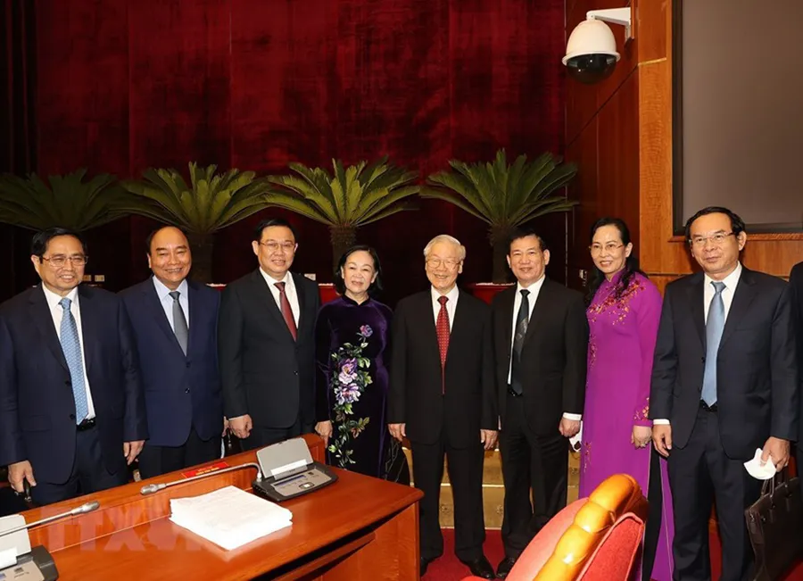 Tổng bí thư Nguyễn Phú Trọng, Chủ tịch nước Nguyễn Xuân Phúc, Thủ tướng Phạm Minh Chính và Chủ tịch Quốc hội Vương Đình Huệ dự bế mạc hội nghị. Ảnh: TTXVN
