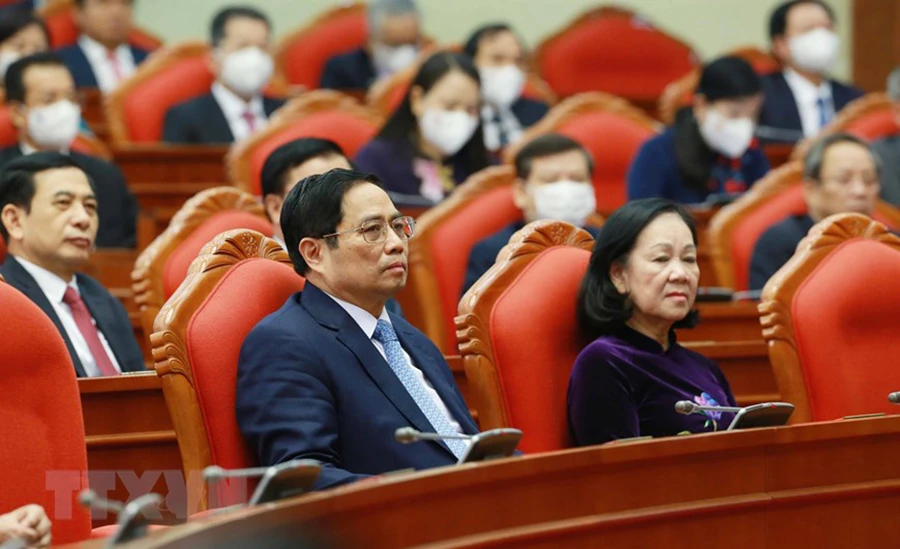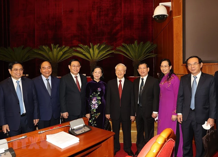 Tổng bí thư Nguyễn Phú Trọng, Chủ tịch nước Nguyễn Xuân Phúc, Thủ tướng Phạm Minh Chính và Chủ tịch Quốc hội Vương Đình Huệ cùng các lãnh đạo Đảng, Nhà nước dự phiên bế mạc hội nghị. Ảnh: TTXVN