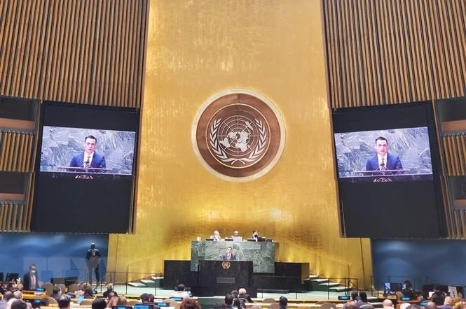 Trưởng Phái đoàn thường trực Việt Nam tại LHQ - Đại sứ Đặng Hoàng Giang phát biểu quan điểm của Việt Nam về tình hình Ukraine, tại phiên họp đặc biệt khẩn cấp lần thứ 11 của Đại hội đồng LHQ, ngày 1-3-2022. Ảnh: TTXVN