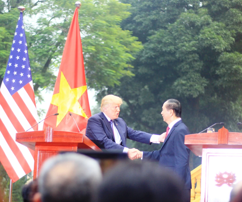 Tổng thống Mỹ Donald Trump và Chủ tịch nước Trần Đại Quang sau buổi họp báo sáng ngày 12-11. Ảnh: Zing.vn