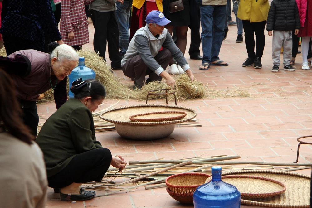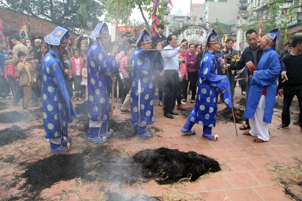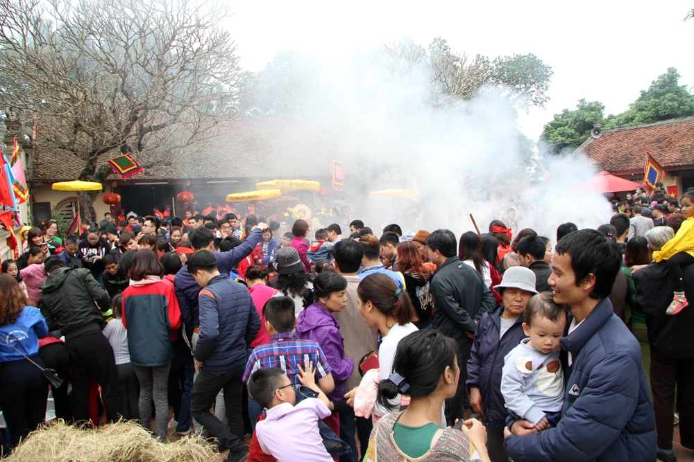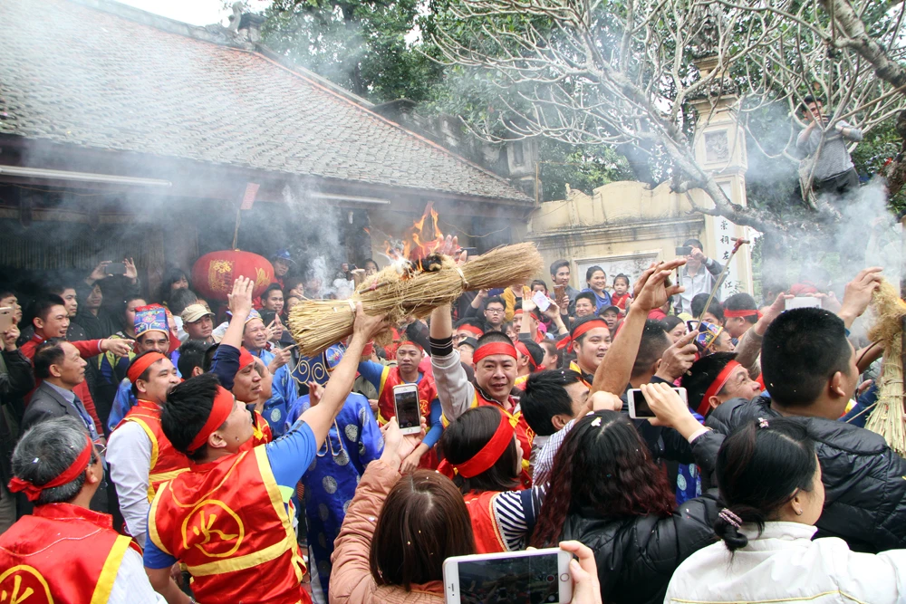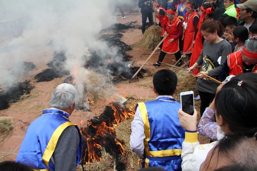 Trong tiếng trống rộn ràng, với sự cổ vũ nhiệt tình của dân làng và khách thập phương, bốn đội thổi cơm thi với đồng phục khác nhau, mỗi đội 10 người gồm cả nam và nữ đại diện cho bốn giáp của làng. Phần thi kéo lửa được diễn ra ngay trước cửa chính của đình.