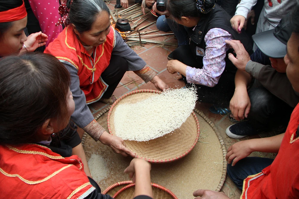 Sau khi giã xong, gạo sẽ được đổ ra, một người dần sàng cho sạch trấu cám và thổi cơm.